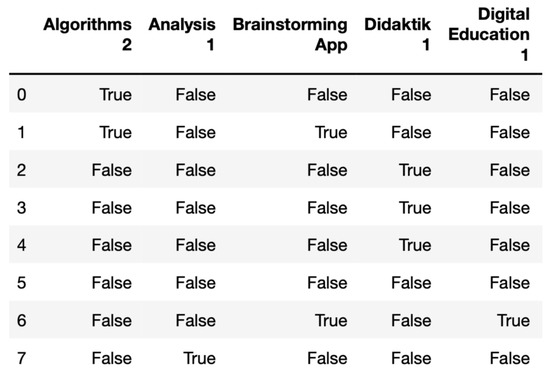To demonstrate the procedures described in the previous sections, this part of the article uses generated sample data for demonstration purposes, as not enough real data were collected yet at this time. The following example uses a small sample of data from teaching to show how the association algorithm is used to identify frequencies, which in turn can be used to describe a pattern. The data describe three courses (Algorithms 2, Didactics 1, Statistics, Digital Education 1, and Analysis 1) and which digital tools and software were used during the introductory phase of lessons.