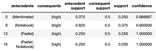 The results in Figure 8, show frequent associations with a high impact on student activation. The support of each association is >0.25 and confidence >0.66. In particular, the combination of Padlet, Notebook –> high(support s = 25%, confidence c = 100%) showed a particularly strong criterion for cognitive activation, which also can bee seen in the single associations of Padlet and Notebook in Figure 8. But the support of this association rule shows a low importance in this small dataset.