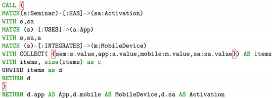 Therefore, first data were retrieved from the graph database (Neo4j) using the Cypher database query language for further processing. The query in Listing 1 includes a sub-procedure (CALL), which first queries the relationship between “Seminar” and “Activation” with the MATCH query. The result of this is passed via WITH to another query to the “App” node, and so on. At the end, the entire queries are aggregated in a list with COLLECT and passed to d via RETURN. The output of the database query is shown in Figure 6.