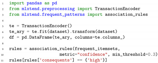 In order to analyze the data from Listing 1 using the Apriori algorithm, we chose Python and Jupyter Notebook and the library mlxtend (http://rasbt.github.io/mlxtend/ accessed on 19 April 2021), which offers also an association rule function. The code in Listing 2 shows how the association rules from the data retrieved above were calculated.
