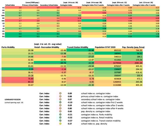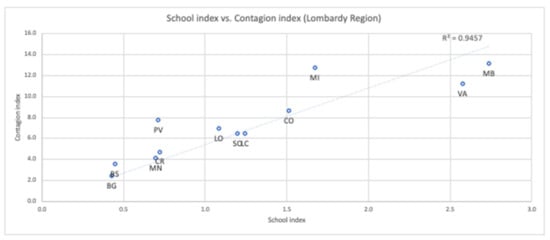 Let us now consider what happened in the first two weeks after the school reopening (14 September–28 September) where theoretically the effects of the school were just beginning to be visible: it is noted how there is no correlation between the school contagion index and the global contagion index at two weeks (CI = −0.10). If, on the other hand, we look at the correlation between school contagion and the index of contagion two weeks after the reopening of schools, we have a clear correlation with CI = 0.69, which rises further considering the effect after four weeks with CI = 0.80. For the entire reference period the CI rises to CI = 0.89) as clearly depicted in the scatter plot of Figure 3 (the linear regression trend line as the R2 coefficient of determination with a very high value R2 = 0.94). The correlation indices are identical if the school contagion data is separated between primary and secondary school. It is interesting to observe the correlation between the contagion index and the population density (CI = 0.60) but not between the school index and the population density (CI = 0.37). If, on the other hand, we observe the correlation between the contagion index and the mobility indexes, we note that the lower mobility registered with government restrictions and DPCM (Decreto del Presidente del consiglio dei ministri) does not have an interdependence relation with the contagion more or less accentuated in the various provinces of RL, with the exception of transit station mobility that shows a correlation CI = −0.57.