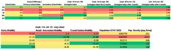 As for Campania Region (Figure 4) and its five provinces (SA Salerno, NA Napoli, CE Caserta, BN Benevento, AV Avellino), schools reopened two weeks later than RL and were closed in advance, starting from 16 October and until 13 November. We observed the following statistical behavior between the contagion variables in the schools and the subsequent contagion in the regional provinces: in the first few days after the schools re-opening (28 September to 12 October) the correlation index is equal to CI = 0.51 and then increased after two more additional weeks to the strong value CI = 0.93 (i.e., showing the clear impact of schools reopening). The global correlation index is equal to CI = 0.47, with a behavior that is in line with the one observed for Lombardy Region. There is only a temporal shift ahead, since RC reopened schools two weeks later than RL. Moreover, also for RC, a strong correlation exists between the contagion index and the population density (CI = 0.74). As for mobility data, a strong correlation index is detected only between the contagion index and the retail and recreation mobility (CI = 0.86), thus suggesting that this mobility factor may have had an impact to the spread of COVID-19, too.
