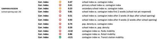 Campania Region data set for school contagion index and overall contagion. Correlation study.