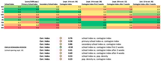 To reinforce our findings, we extended our analysis evaluating also the Emilia Romagna Region and its nine provinces (BO—Bologna, FC—Forlì-Cesena, FE—Ferrara, MO—Modena, PC—Piacenza, PR—Parma, RA—Ravenna, RE—Reggio Emilia, RN—Rimini). For this region, the identified cases are 3050 out of 19,670 total cases (15.5%), in the reference period 14 September–30 October, with a similar % to RL. Moreover, REm followed an opening/closure strategy such as the one applied to RL. As depicted in Figure 5 and Figure 6, correlation between the school contagion index and the overall contagion index per each province increases over time, starting from an inverse correlation at the beginning of school reopening CI = −0.50 to an index of CI = 0.41 after two weeks, and CI = 0.69 after four weeks since school reopening. The index for the overall period is CI = 0.76 with the secondary school impacting more than the primary school (CI = 0.86 vs. CI = 0.58). Hence, also in this case, the detected behavior is consistent with the one observed in RL and RC.