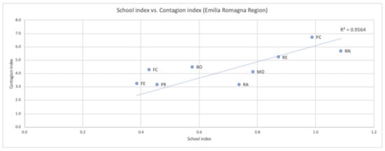Emilia Romagna scatter plot for school contagion index vs. overall contagion index.