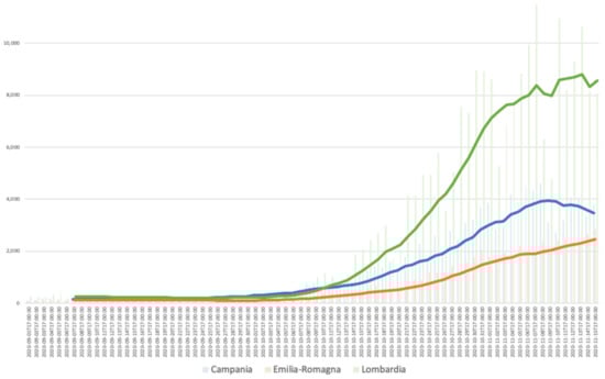 3.1. Comparing Lombardy, Campania and Emilia Romagna Contagion Indexes