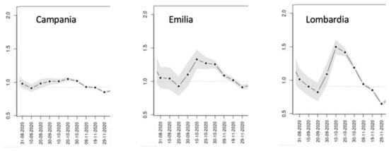Rt trend for the three Italian regions: Campania, Emilia and Lombardy.
