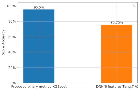 In this evaluation, the accuracy metric is chosen in order to measure the performance of the proposed method against the results of Tang [27] on the binary classification task. The binary classification task represents the model’s ability to detect whether there is an attack or not in the network environment. The accuracy metric measures tolerance, or how close the predicted classification values are to the true values. As shown in Figure 6, the proposed XGBoost algorithm with the selected five features achieved a high accuracy score of 95.55%, compared with the deep neural network with six features proposed by Tang [27], which had a score of 75.75%. In addition, from the previous Figure 5, we showed that the proposed model performs with high precision, with a score of 92%. Higher precision is related to reproducibility and repeatability; it is the degree to which repeated measurements on the classification task, under unchanged conditions, show the same results. We conclude from the previous scores that the proposed algorithm is accurate and stable in the binary classification task.