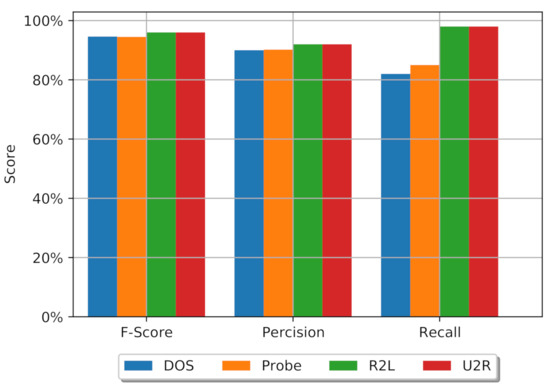For precision and recall, the detection scores for R2L and U2RL achieved similar scores of 92% and 98%, respectively. For DOS and Probe, the model achieved slightly similar precision scores of 90%, 90.1%, and recall scores of 82% and 85%, respectively. We conclude from these F1-scores that the proposed model has a difference of only 2% in its performance against the four categories of attacks, while precision and recall differ by nearly 7%. This shows that the proposed model is forceful, effective and energetic, and can be applied to several types of attacks without weakening its performance.