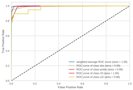 For another evaluation of the proposed model on the four types of attacks, to make sure that the proposed method’s performance is efficient and capable, we used Receiver Operating Characteristic (ROC), which plots and measures the trade-off between TPR (recall, or probability of detection), and FPR, known as the probability of false alarm. Afterwards, we compute the Area Under Curve or AUC, to measure the overall 2-D area under the all-ROC curve. AUC gives us the accumulated performance over all the possible classification thresholds. AUC is scale-invariant and threshold-invariant: it is not a function of threshold, like F-score; it is an evaluation of the classifier as threshold versus overall possible values. As shown in Figure 8, the AUC value achieves 99.94% for all four classes. Hence, another evaluation method proves that the proposed method is qualified and skillful in attack classification.