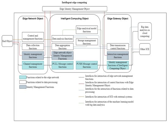 IEC is also considered to be mobile communication infrastructure that provides smooth and efficient communication between different mobile devices. Moreover, IEC is a design that aims to reduce bandwidth and delay by moving the required resources closer to the systems that demand them. The background to this claim is based on the promising expectation of lower capital expenditures and the potential to introduce new services, which could potentially be offered separately and could also be launched at a reduced cost. Among these new services is the potential to provide ultra-reliable and extremely low latency (URLLC) connections [6,8]. For instance, less than 5 ms or less than 10 ms, for autonomous Vehicle-to-Everything (V2X), Augmented Reality (AR ) and Virtual reality (VR) applications. Subsequently, the architecture of IEC orchestration is shown in Figure 2, in which it consists of several functional blocks deployed in each IEC object. Besides, the functions of this architecture can be divided into three parts, namely border network functions, identification functions and data processing functions.