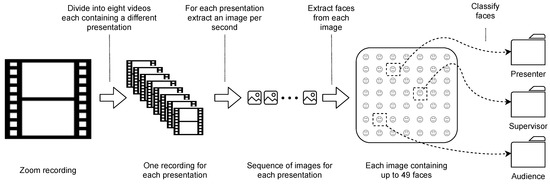 Overview of the data pre-processing steps. Each recording is divided into eight videos and each contains a different presentation. We then extracted one image per second for each presentation video. Finally, we extracted all faces from a single image and classified them into presenter, supervisor, and audience.