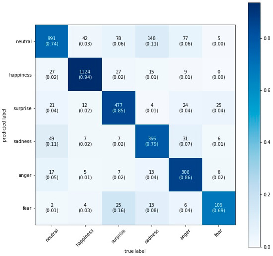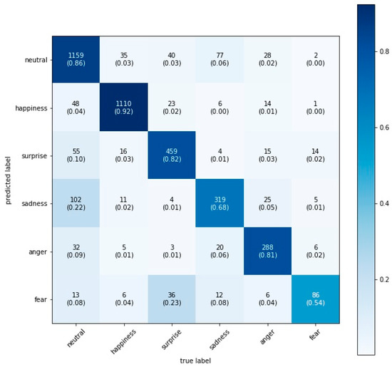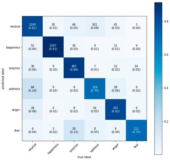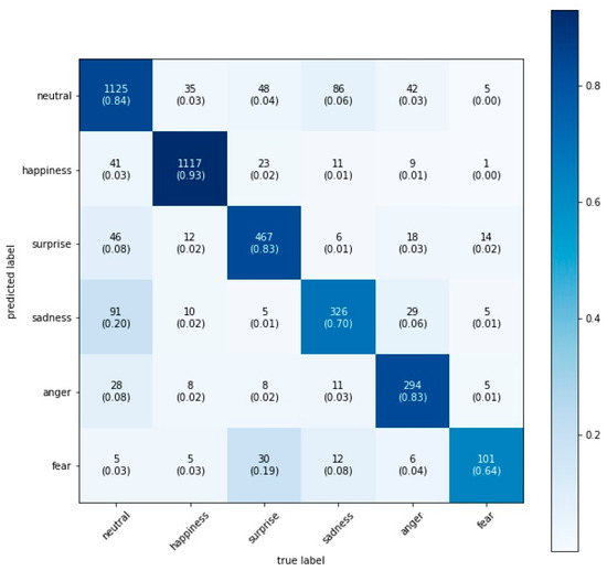 We found that the VGG16 model performed best with a test accuracy of 84.0%, closely followed by the Xception model with 83.7%, the VGG19 model with 83.6%, and the VGG13 model with 82.6% (see the confusion matrices on the test set for each model in Figure 2, Figure 3, Figure 4 and Figure 5). Figure 2 illustrates the confusion matrix on the test set for the VGG16 model including the in-class precision for each emotion: 84% neutral, 93% happiness, 83% surprise, 70% sadness, 83% anger, and 64% fear.