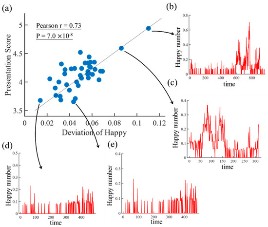 (a) Illustration of the correlation between presentation score and the audience’s deviation in happiness. We can see that presentations which caused wide fluctuation in happiness among the spectators achieved higher scores (b,c) than presentations which did not cause fluctuation in happiness among the spectators (d,e).