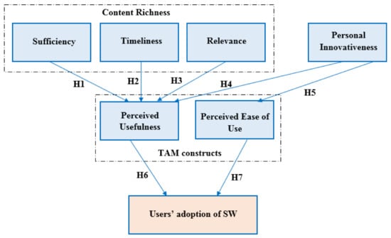 The current study assumes that content richness and personal innovativeness have a close relationship to TAM constructs of perceived usefulness and perceived ease of use. The TAM model has been extended to include the external factors of content richness and innovativeness to measure the final goal of SW adoption. The following sections provide more insight into this issue.