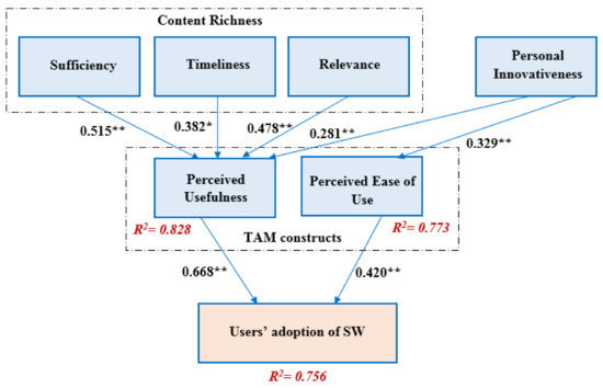 The testing of the structural model is usually done based on the measurement of coefficient of determination (R2 value) [71]. The coefficient is expressed as the squared correlation between actual and predicted values of the particular endogenous construct, and the main aim of this coefficient is to measure the predictive accuracy of the model [94,95]. The coefficient indicates the cumulative influence of the exogenous latent variables over an endogenous latent variable. As the coefficient is the squared correlation between the actual values of the variables and the predicted values of variables, it introduces further the sense of variance degree in the endogenous constructs. The value is considered to be high if it exceeds 0.67, which indicates that the values ranging from 0.33 to 0.67 are direct ones and the value between 0.19 to 0.33 are considered weak values. The value is termed inadmissible if it is smaller than 0.19 according to [96]. As seen in Table 9 and Figure 2, it is clear that the model had high predictive power, supporting very nearly 75.6%, 77.3%, and 82.8% of the variance in the adoption of SW, perceived usefulness and perceived ease of use, respectively.