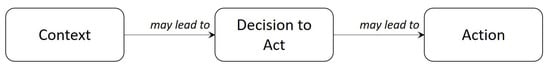 The Theory of Planned Behavior (TPB) assumes that a decision to act precedes the action or the actual activity itself. The separation between a decision to act and the action itself is important: we may decide to do something, but not actually do it. The decision to act is the result of a response to a given context. This is summarised in Figure 1. The context construct may include characteristics of the individual, of the situation itself, of the activity they are evaluating or of any other background factors. For instance, Figure 2 provides interpretations of Terms of Use ((a) the upper half of the figure) and Research Consent ((b) in the lower half) as behavioural responses.