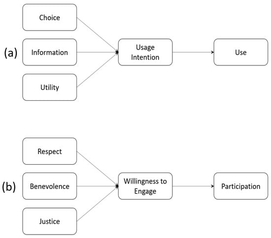 How users decide to engage with technology, especially for services like contact tracing, needs to consider issues of consent. This is not always the case (see [23]). Traditionally, causal models predicting technology adoption have focused particularly on features of the technology itself, such as perceived ease of use and perceived usefulness [67]. The Context (see Section 3) derives solely from the technology. Other variables associated with technology uptake such as the demographics of potential adopters, any facilitating context and social influence have been identified as moderators, however [68]. McKnight, Thatcher and their colleagues combine these technology-based approaches with models of trust, however [69,70,71]. In so doing, they extend the influence of social norms identified by Venkatesh [68] to include a trust relationship with relevant human agents in the overall context within which a particular technology is used.