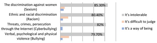 Figure 1 shows that the participants believe that the following is absolutely intolerable: the discrimination against women (Sexism) (85.3%); the threats, crimes, persecution through the Internet or mobile phones (Cyberbullying) (81.8%); ethnic and racial discrimination (Racism) (80.4%) and verbal, psychological, and physical violence (Bullying) (79.7%).