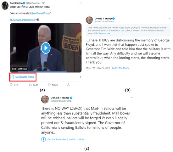 Twitter’s tags: (a) manipulated media tag [46], top left, (b) glorifying violence tag, top right [47], and (c) ‘get the facts’ tag, bottom [48].