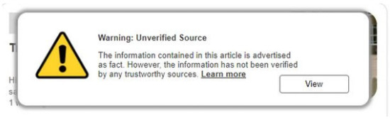 Recommendation label warning that the content’s source is unverified. Allows the user to continue to view the content or click a link to learn more information.