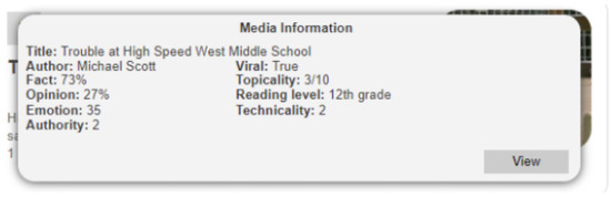For news content, a hybrid label could include the number of citations and the average number of citations for an article of similar age and on a similar topic. In addition to stating that a video has been “edited from the original source”, the label could state that “this video may not accurately represent the facts”. An expanded version could include multiple categories of pertinent information along with context for each. The recommendation may be implicit through this contextual information. For example, in Figure 8, the fact that the article has an ‘emotion’ score of 12% is given context by stating that ‘often credible sources have less than 7%’.