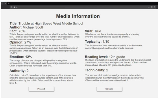 Unfortunately, not all of the categories proposed by Fuhr et al. [34] have a logical “recommended daily allowance”. It is further unclear as to what a user would be expected to do if they do not meet a relevant standard (such as the reading level) or how others (such as virality) may inform reader decision making. Finally, the fact percentage rating is inherently problematic as a purely factual article may be biased if important related facts are omitted.