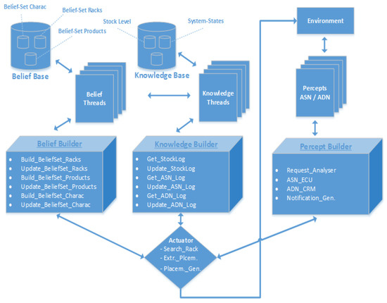 The foundations of the AOSR algorithm [26] are based on the classical belief desire intention (BDI) agent model architecture [39] in conjunction with the constructs and AOSF’s agent categorisation [25], which enables it to support a dynamic environment and remain flexible. As depicted in Figure 1, the architecture of the AOSR 2.0 algorithmic heuristics incorporates concurrent information threads [28] for defined products and racks, as well as their characteristics and categorisations, via an important component called the Belief Base, which serves as the main source of truth. Information regarding stock levels and current system states are recorded or supplied via another parallel component called the Knowledge Base, which keeps itself updated from the information provided by actuators. The Knowledge Base continually uses actuators to update general information that is taken to be true from the environment and the Belief Base keeps information that is considered a central fact to compare with environmental percepts, but can be revised based on repetitive factual information from the environment. There are three main actuators used in the AOSR 2.0 algorithm: (i) Search Rack; (ii) Placement Generator; and (iii) Extract Placement. These actuators are responsible for sensing the percepts from the environment and updating the Belief and Knowledge Base via the Knowledge Builder and Belief Builder as detailed in Algorithm 1.