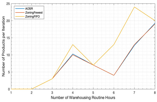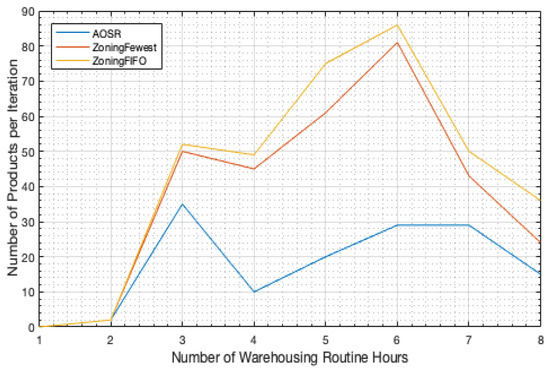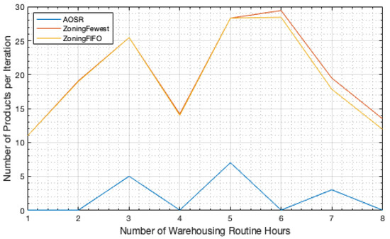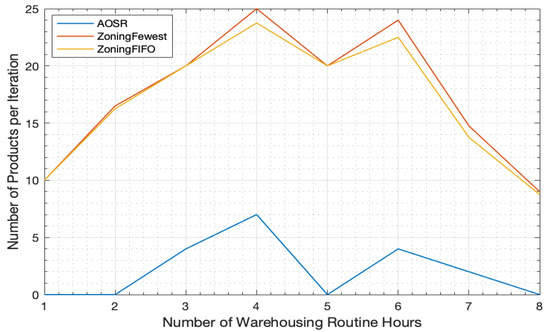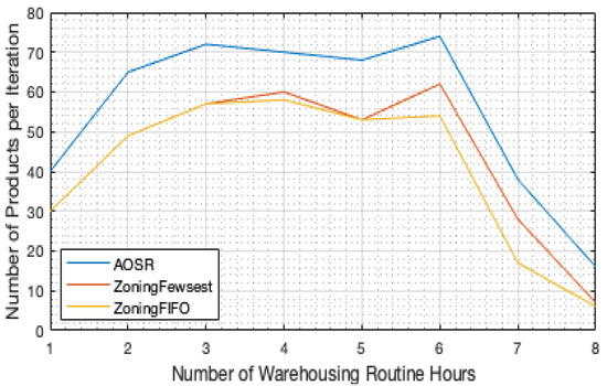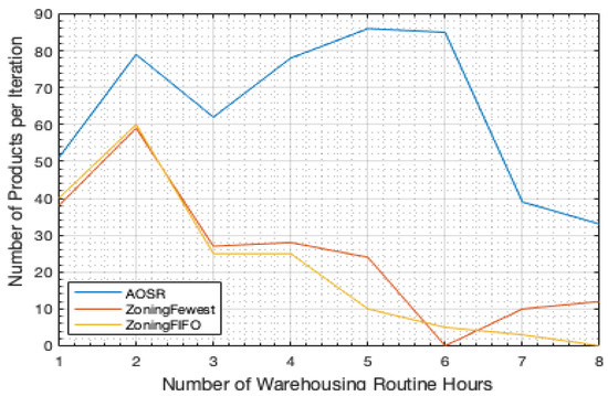 Figure 2 represents the results taken from System State 0. The results reflect the difference between the tested approaches for the applied test dataset for a full routine day. The number of transactions and iterations are divided into hours (represented on the x-axis) and the number of products being shipped or delivered to the warehouse (represented on the y-axis). The graph reflects that there is no major difference in the two standard warehousing logics, zoning with FIFO logic and zoning with fewest logic. Although the results generated by AOSR 2.0 represent almost the same pattern, the situation is 10–15% better than the other two approaches as it stores more products in the racks than either of the other two strategies, which is considered a high-performance efficiency metric in a warehouse environment [33]. Nonetheless, all three curves move down after the 6th hour because they reach capacity in the constrained environment. AOSR 2.0, in this scenario, follows the same trend as the other techniques (with better performance than the others because it follows the strategy to keep the minimum possible number of products at the product receiving area) as it utilises its hybrid logic and is not offered a situation where its re-slotting strategy can be utilised since no delivery operations are performed. In System State (1) the performance improvement of AOSR 2.0 over the other techniques is more easily noticed, i.e., in Figure 3.
