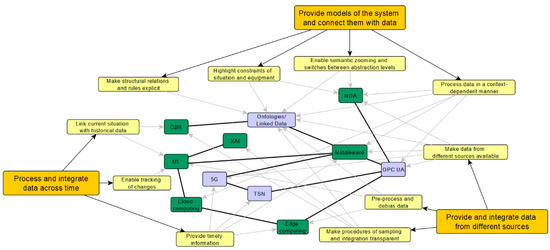 Overview of technologies. Yellow boxes represent functional requirements, green boxes represent technical concepts, and purple boxes represent specific technologies. Concepts and technologies are linked to both the functional requirements (grey arrows) and to each other (black bold lines).