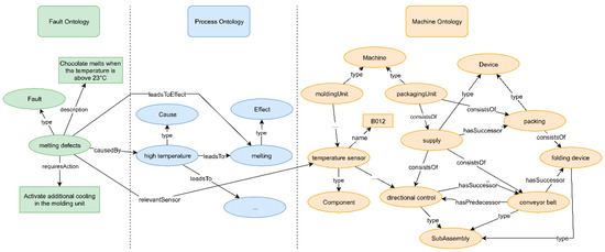 However, modelling the physical setup only is a first step, and additional models are needed. In the process industries, the required models are summarized in the products–processes–resources (PPR) framework. Process models contain information about the current and future state and behavior of the chemical process, process relations (e.g., thermodynamic, chemical), suitable operation ranges, or safety-related issues. Product models refer to raw materials, intermediates, waste, and end products. They encompass factors such as the physical properties of pure substances, nonlinear interactions in mixtures, product specifications, and risks for human health or the environment. Finally, resource models describe the physical and functional properties of equipment and instrumentation, its behavior, interdependencies between local control units or modules, and requirements for performance and maintenance. The integration of these partial models is crucial to formally describe the transformation of substances and the abilities of a plant or production line, which is a prerequisite for operation models that are required to derive optimal process parameters and interventions [122,123]. However, this integration is challenging as the partial models stem from different trades with different perspectives (e.g., machine builders vs. process engineers). Therefore, ontology-based collaboration environments for concurrent process engineering have been developed to facilitate model integration [124], and different ontology-based integration strategies have been compared [121].