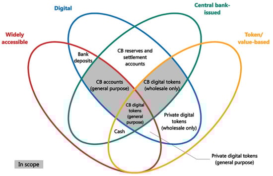 However, one should note that a CBDC is not a Bitcoin-like or a stablecoin-like cryptocurrency governed by a central bank, nor the simple digitalization of cash. On the one hand, CBDCs may implement completely different currency concepts that share little more than their immateriality and the acronym; on the other hand, the implementation of CBDCs will have economic implications that surpass, by far, the changes in individual behavior produced by the digitalization of payment instruments. Bech and Garratt [] proposed the most used and up-to-date systematization of the contemporaneous coexisting types of money, which became known as the “money flower”. Besides the restricted-access digital token for wholesale settlements, CBDC refers to general-purpose money, in the form of an account held by the public directly at the central bank, akin to the accounts commonly held at commercial banks (account-based) and digital cash, the equivalent of physical banknotes, sharing many of the same properties, including the privacy of transactions (token/value-based).