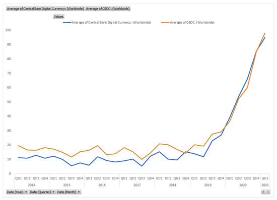 The worldwide interest in CBDCs is also visible in Google Trends search data results for the expression “Central Bank Digital Currency” []. A steep increase is noticeable in the most recent years. To reduce seasonality effects, we present the monthly data averaged by quarter in Figure 2.