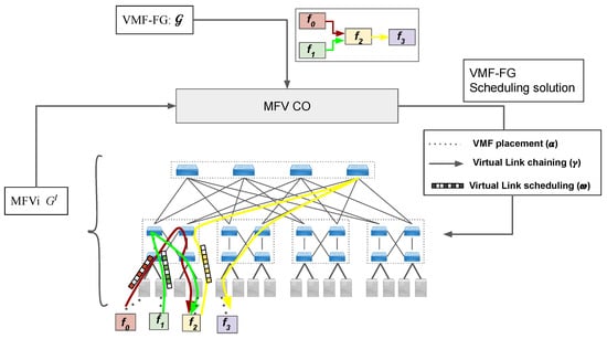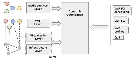 Another important architecture component is the control and optimization (CO) layer. The roles of the CO layer include the management of other layers and the distribution of control signals to VMFs. In addition, the layer is responsible for scheduling the media service’s VMF-FG to the MFVi. The CO layer is responsible for solving the VMF-FG scheduling problem by taking various input parameters as described in Section 4 into account. An optimization algorithm then generates a solution that describes the mapping of VMF-FG along with the VMF and virtual link schedules, as explained next. The mapping and the schedule can then be used to configure various MFVi components so that the required guarantees are met.