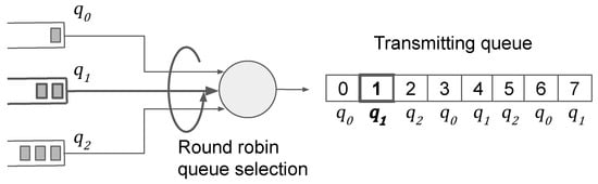 Contrary to CQF, CSQF specifies the transmission time of packets along the path between the source and destination. The requirement to receive the packet in the cycle it was transmitted is no longer required. To achieve this, each CSQF-enabled node is equipped with multiple queues (generally ) per port, as shown in Figure 2. During a cycle time, one queue receives packets from the upstream nodes, and another queue transmits the packets it has received in the previous cycle. Here, another queue allows reception of the packets that were supposed to arrive in the next cycle. The early arrival could be due to variation in the processing time of the previous node. Moreover, this queue can be used to delay the arrival of specific packets by . The role of packet transmission (and reception) is rotated cyclically among all the queues in each . The time after which the application sender repeats the transmission pattern is referred to as a hypercycle, usually expressed as a multiple of cycle times.
