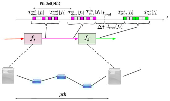 For each (already placed) neighboring VMF DwstrNbrs downstream to f, the scheduling of VMF f and the associated virtual link is iteratively attempted using procedure VlinkSch. The tentative node to place f is selected using the next-fit algorithm, starting from the same node where is placed, i.e., , then the next node and so on (). The neighbors of f are then added to the VMF queue (l. 12–14). Next, we describe the procedure for virtual link scheduling in detail.