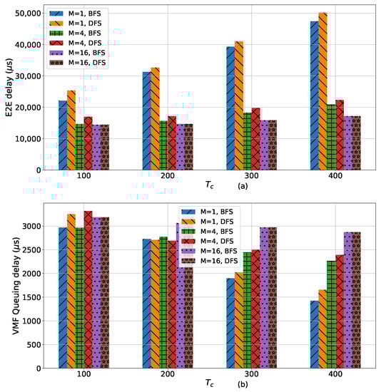 It is interesting to note that the E2E delay as well the VMF queuing delay for DFS is more than with BFS. As scheduling occurs on a path-by-path basis, the scheduling on one path is impacted by the previously scheduled path, thus increasing the E2E delay on the longest path. On the other hand, for BFS, all paths have relatively similar delays, thus reducing the E2E delay along the longest path.