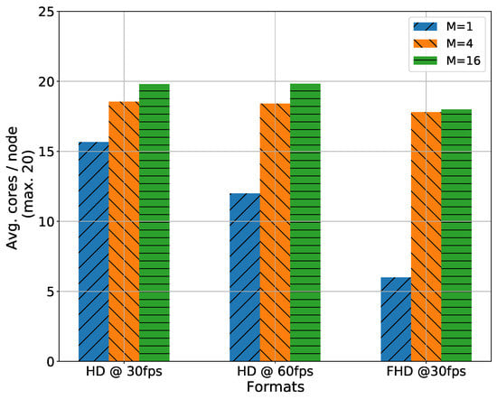 Here, we report the impact of media formats on the performance of the scheduling heuristic with BFS traversal. The format of media streams affects resource utilization efficiency. Figure 7 compares the average number of cores used per node for three different video formats. With no VMF-FG decomposition (), the average core utilization decreases with higher quality of media formats. The network bandwidth increasingly becomes a bottleneck with an increase in media quality; thus, fewer VMFs are placed at a node even if free cores are available. The average core utilization for DFS is not reported as it remains same as BFS.