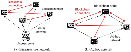 In the IoT field, many works use the private blockchain in decentralized IoT systems. However, the underlying network is commonly omitted or regarded as an infrastructure-based wireless network. For example, in the blockchain-based smart home in [24], the system’s backbone comprises several cluster headers, which manage private blockchains for their cluster. The underlying network in each cluster is not discussed, while IoT devices in each cluster are connected to a Wi-Fi access point or a cellular base station as default. In another smart home with blockchain [9], the Raspberry Pi Model 3B and DHT11 sensor are used to monitor temperature and humidity with a DHT11 sensor. The monitoring results are presented to the Blynk App on the smartphone. However, the system runs over a Wi-Fi access point, according to the smartphone screenshot. The blockchain-based healthcare systems described above are usually built over infrastructure networks, as illustrated. In [12], the authors considered different underlying networks in a real-world private Ethereum application. In this work, the Wi-Fi and 3G cellular networks are involved in a blockchain-based flood monitoring and detection system. A comparison work in [25,26] indicates that decentralized generated mesh networks have a higher efficiency to cover irregular spaces than centralized generated ones. A decentralized network could automatically adapt according to local information, which is capable of avoiding SPoF. Thus, decentralized ad hoc networks may be an alternative to build blockchain networks with higher robustness.