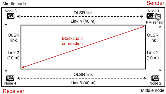 In our evaluation, we deployed four RPi4 nodes on the fifth floor of the first building in the Faculty of Engineering, Chiba University, with the topology shown in Figure 2. The distances between nodes are illustrated in the figure. The figure also illustrates the distances between the nodes. The hardware configurations of each RPi and software are listed in Table 3. Since RPi4 is capable of mining blocks, a centralized, powerful mining node is not necessary in this case. The wireless adapters were configured in the ad hoc mode to run the OLSR protocol. We adopted the OLSR implementation from the OLSRd package (http://www.olsr.org/mediawiki/index.php/Releases (accessed on 21 June 2021)). In each RPi node, the OLSRd module was configured with the default Willingness value (equalling 3), indicating the willingness to become an MPR. The nodes ran the Ethereum client, the unmodified version of Geth (https://geth.ethereum.org/downloads/ (accessed on 22 June 2021)), to form a private blockchain that starts with a custom genesis file in Geth. The Nova PM Sensor SDS011 air quality sensor was used, which can detect the 0.3–10 m particle concentration in the air. The output data of Nova Sensor include the PM2.5 and PM10 indexes. The sensor could be programmed with the sds011-client module (https://github.com/ivkos/sds011-client (accessed on 21 June 2021)) for Node.js. We allowed the sensor work to be in active or query mode. In the former, the sensor actively released data as soon as they were available, while, in the latter, the sensor passively responded to requests at a periodic pace.