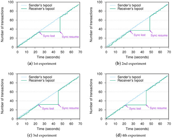 This section evaluates and quantifies the performance of blockchain connection when it recovers from a failure in the underlying network. More specifically, there is an MPR failure during the blockchain operation. The sender keeps requesting data and streaming transactions at the speed of one transaction per second (tps). Transactions are propagated to the receiver via a selected MPR (Node 2 or Node 3), which can be observed with tcptraceroute tool. We then force the MPR node to shut down. On the collapse, the blockchain connection and transaction stream to the receiver are interrupted, thus the receiver loses synchronization with the sender. However, the network is not recovered immediately. The sender initially needs to confirm the MPR is out of connection by the expiration of the latest HELLO message according to Equation (1). Second, the sender selects a new MPR (the left alive node) and notifies the new MPR to start packets forwarding within the following HELLO messages. After acknowledgment of the new MPR node, packets including OLSR and blockchain messages finally get their destinations. The blockchain re-certifies the connection and resumes the transaction synchronization. In our experiment settings, equals to 2 s, thus becomes 6 s. is set to 20 s in the configuration file. is greater than , which means the sender needs to wait for the expiration of the last legal HELLO message for over 20 s. Then, it calls for a new MPR node in the next 2 s with the pace of HELLO message dissemination. The entire recovery time is reflected in the number of transactions in both sender and receiver’s Txpool. We record the accumulated number of transactions in the Txpool of both sides via inter-process communication (IPC) and show the cumulative curve of four measurements in Figure 3. We can see that the trend in the four subfigures is similar. After the failure, the transactions are queued at the sender’s txpool (the “Sync lost” mark). When OLSR finds a new route, the operation is back to normal at the “Sync resume” mark. From the experiment results, the recovery time from when the synchronization is lost to resumed has an average value of 22.3 s, which proves the blockchain is recoverable from the underlying network failures.