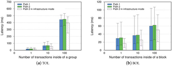 In an ad hoc network, nodes can directly communicate with peers in their wireless communication range. Deploying the OLSR protocol will provide paths to other nodes in the network. In our experiment, the connections between peers are marked as OLSR links, as shown in Figure 2. The distances of Links 1 and 2 are 10 m, while those of Links 3 and 4 are 40 m. As a result, the blockchain communication between the sender and the receiver can go through two paths denoted as Paths 1 and 2. First, we evaluate the performance of each path with Ping time, packet loss rate, and throughput. We use the iperf3 tool to measure those performance metrics, and the results are shown in Table 4. It is obvious that the OLSR link has a better performance when the nodes are between a shorter distance. The table also shows the comparison of wireless link performance in an infrastructure network with Wi-Fi. We replace Node 3 with an access point; hence, Path 2 becomes the infrastructure-based links. We let the packets pass through the same path for comparison. We can see that the transmission delay is smaller in the infrastructure mode, and the loss rate is lower, which lead to a shorter propagation latency in the later measurements.