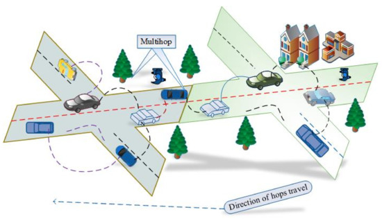 The authors in [20] proposed a multi-hop clustering scheme for VANET. To establish multi-hop clusters, a state-of-the-art mobility mechanism was presented to serve correlative mobility among nodes in multi-hop radius. This scenario presents that hopsector clusters also elongate the communicating area of clusters and attain betterment when differentiated with sole node clusters. The authors in [21] developed a clustering-based medium access control protocol for reducing conflicts in VANET. This scenario employs dynamic multi-hop clustering to improve network enforcement and provides security applications in highway conditions. The authors in [22] developed a schema for a fifth-generation cellular system to provide wide coverage. The authors in [23] developed an architecture to support data sharing in edge computing. In addition to these, some other works [24,25] inquired about the performance of safety-associated application depending on criteria such as forwarding node ratio, utilization rate of the slot, transmission overhead, end-to-end delay, and throughput.