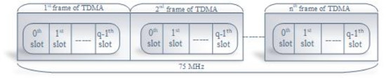 From Figure 4, we can observe that a TDMA frame is divided into ‘q’ time periods beginning with the slot and ending at the ‘’ slot. Synchronization of the first TDMA frame is performed by the slot. Later, it transfers the slot-assignment state (SAS) enclosed in the specified cluster such that each hop is provided with dedicated time slot for data transmission. In the Figure 4, the slot to slots are used for transmission of data.