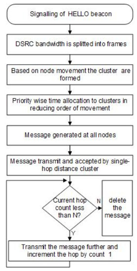 The flowchart of the proposed MAMC-MAC protocol is shown in Figure 5. First, HELLO message signaling grants nodes within the network to become familiar with each other’s coordinates. Next, in our approach, we split the complete DSRC band into frames so that the complete bandwidth is available for transmission of a safety message. Later, clusters are formed depending upon the mobility pattern congregated to beaconing of the HELLO message. Furthermore, frame assignment to the clusters is performed depending upon their mobility pattern. This implies that a greater number of frames are assigned to the clusters with maximum speed. This guarantees the successful transmission and strengthens channel utilization. These frames are further split into a number of slots. For transmitting a message, each node is assigned to a slot. Now, consider initiation of the safety message at node i and transferred to the clusters with a hop distance of (i+), with representing the message hop count. At first, we consider the value to be 1. Whenever the clusters near one hop receives the message, it is verified for the present . If the value is less than M, for M = 4, the message is transmitted and the value of is augmented by 1. Similarly, the message is relayed and broadcasts up to M nodes far away clusters. We assume to be 4 because the message is no longer relayed when becomes greater than M hops and is discarded as obtained from the performance evaluation.