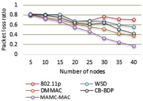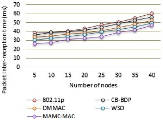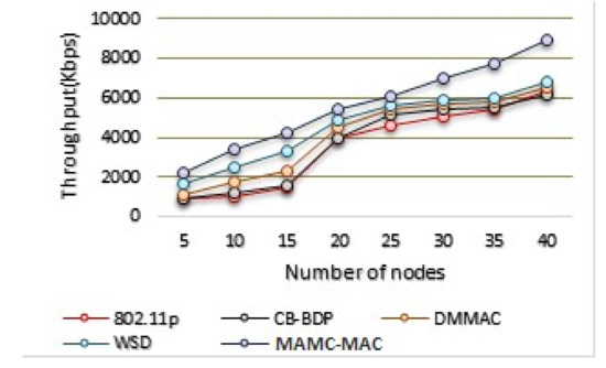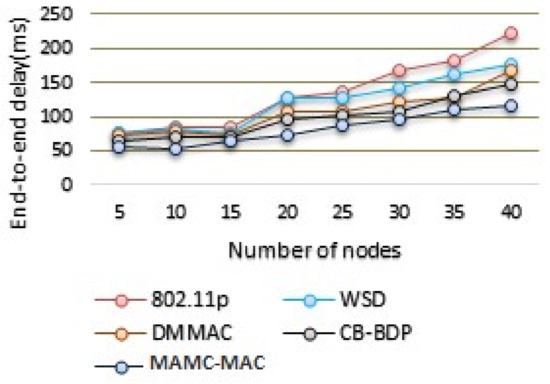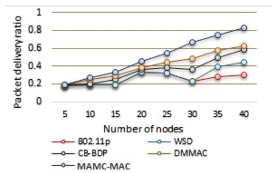 It is defined as the time taken in forwarding a packet from the starting hop to accepting the packet at the target hop. Figure 9 shows the comparison of the MAMC-MAC protocol with IEEE 802.11p and WSD. Here, the WSD scheme is compared for recognizing delivery delay as a stringent QoS requirement. It is observed that a delay arises due to an increase in the number of nodes. MAMC-MAC performs moderately better in terms of delay experienced.