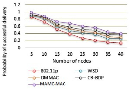 High reliability is essential during safety message dissemination. PSD depends on the entire network capability as well as reliable data delivery. When compared with other protocols, MAMC-MAC displays increased possibility of effectiveness in delivering of messages. Figure 10 shows that the probability of successful delivery in standard protocols is minimized with maximization in vehicular density. However, the proposed MAMC-MAC protocol has a possibility in the range from 75% to 90% for low density, until 20 nodes. As the density increases, the possibility decreases. This reveals that an increase in number of nodes decreases the number of message deliveries.