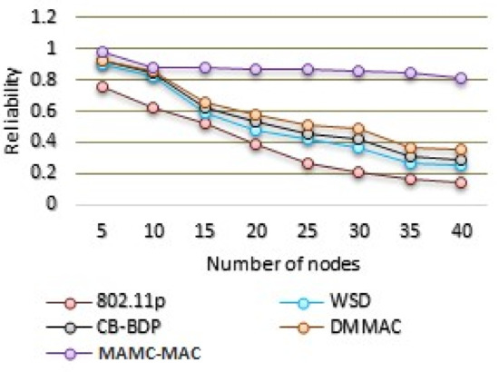 It is defined as the probability of successful message transmission and reception within the cluster and its single-hop remote adjacent cluster. When we focus on safety message diffusion, reliability is one of the utmost key variables. A reliability comparison of our proposed work with other protocols is shown in Figure 11. Under a similar vehicular scenario, the DMMAC protocol only is focused on delivering safety messages. It is noticed that, under the specified simulation conditions, both MAMC-MAC and DMMAC accomplish uniformly good reliability. It is observed that the system accuracy is high in low-density area and marginally minimizes with the increase in vehicular scale.