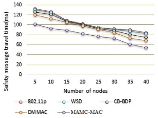 It is the time period taken by a safety message forwarded by a hop to reach its single-node neighbor. Travel time decrease based on the number of nodes is shown in Figure 12. Besides this, as the hop scale is maximized, hopping is incremented, which results in faster message distribution. Furthermore, safety message travel time is increased with a decrease in the node density, which results in clashing of hops in finding a surrounding hop to transfer the message ahead. MAMC-MAC is perceived as having good accomplishments compared to the other protocols because of two limits. Primarily, cluster-head selection is not required in MAMC-MAC. This minimizes the extra periods that would have been taken in the process. Next, because the vehicular density is regarded as stable for the simulation extent, when the nodes are on the roads, HELLO message control is accomplished only once, which helps in minimizing the travel time.