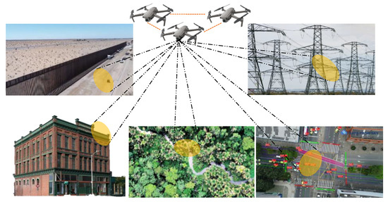 Surveillance involves the monitoring of a person, a group of people, behaviours, activities, infrastructure, or buildings to collect, influence, manage, or guide information. There are several different methods of surveillance, including camera observation, GPS tracking, radio surveillance, and biometric surveillance, among others. Typical surveillance tasks include border patrol, construction management, power grid inspection, traffic monitoring, environmental monitoring, etc. A typical surveillance environment could be large scale and scattered. It is difficult for traditional manual surveillance methods to efficiently locate and reach the locations of concern or faults in facilities.In addition, traditional surveillance is a labour-intensive task: many repetitive tasks in various work scenarios require much manpower, and the labour costs increase year-by-year. With the development of unmanned aerial vehicles (UAVs), computer vision, and sensor technology, UAV systems are becoming increasingly stable and mature in order to solve these difficult tasks at a lower cost and with higher security and reliability [1,2]. UAVs can quickly cover large and difficult-to-reach areas, reducing the labour costs, and they do not require much space for the operators [3]. They have become advanced tools to replace human labour in completing surveillance and in monitoring work efficiently and safely [4]. Figure 1 shows some typical UAV surveillance application scenarios.